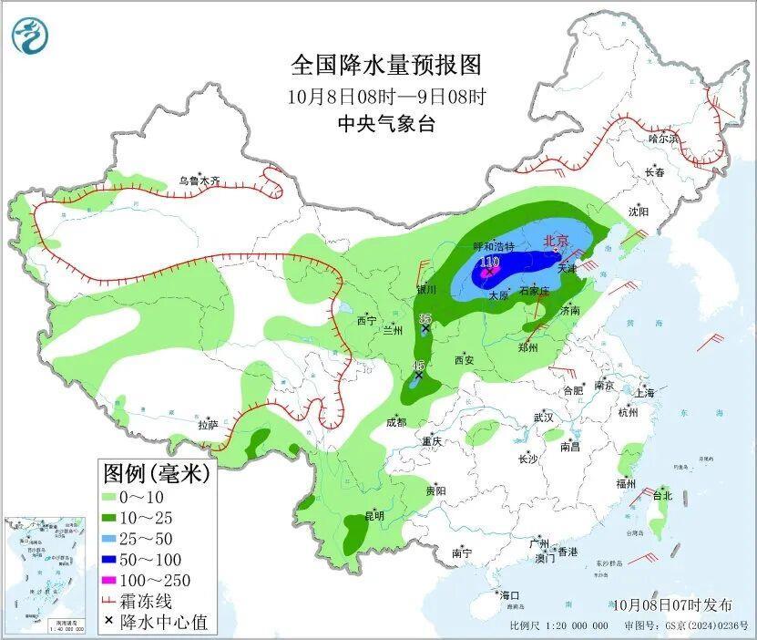 10月8日至9日,川北地区有中到大雨,局地大雨或雷阵雨n盆地、甘肃省东部、宁夏回族自治区、陕西省中北部、山西省中北部、内蒙古自治区中南部和京津冀地区。