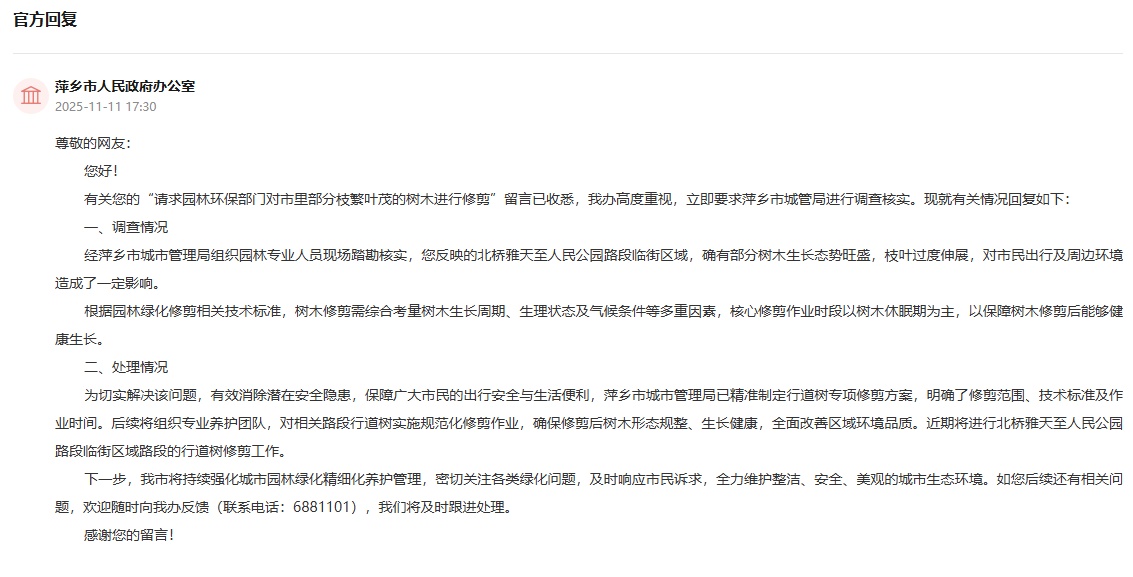 “从北桥雅田到人民公园沿街的树枝杂草丛生,杂乱不堪,公交车经常与树枝刮擦、碰撞。” “秋入冬时,茂盛的树叶变成了落叶,影响了城市景观。”近日,有网友通过人民网“领导公告栏”给江西凭祥市长留言,反映该路段杂草丛生的枝条,希望有关部门予以修剪。回复截图。针对网友留言,萍乡市人民政府办公室立即要求萍乡市城管局对此事进行调查核实。经园艺专家组成的萍乡市城管局现场检查核实,有网友反映,北桥雅田至人民公园路段前的一些树木生长旺盛,枝叶蔓延过远,对市民出行及周边环境造成一定影响。根据园林绿化修剪技术标准,树木修剪需要综合考虑树木的生长周期、生理状态、气候条件等。核心修剪主要在休眠期进行,以保证修剪后树木的健康生长。为有效解决这一问题,有效消除安全隐患,保障广大群众出行安全和生活舒适,萍乡市城管局精准制定了街道树木专项修剪方案,明确了修剪范围、技术标准和工作进度。之后,我们将组织专业的养护队伍,对相关区域进行规范的行道树修剪工作,保证修剪后树木的形态和健康生长,全面提高行道树的美观度。当地环境质量。记者近日获悉,萍乡市正在对北桥雅田至人民公园路段前区行道树进行修剪。下一步,萍乡市将继续加强精细化城市景观维护管理,密切关注各类生态问题,及时回应市民诉求,千方百计维护清洁、安全、优美的城市生态环境。必须解决哪些困难?您可以在人民网“领导公告栏”留言,倾诉您的困难和担忧。