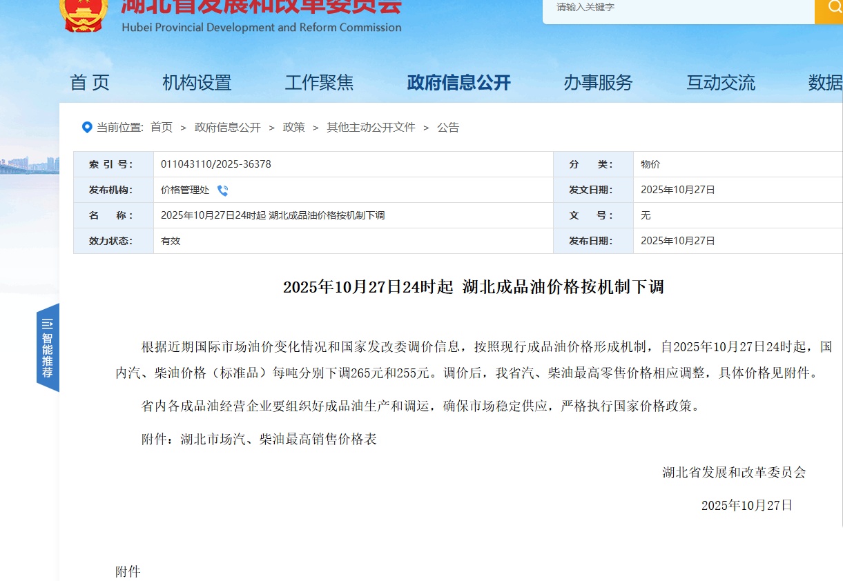 湖北省发改委最新原油调价通知 湖北日报讯(记者谢慧敏)原油价格又要跌了!据湖北省发改委价格管理办公室10月27日消息,截至10月27日零时,湖北省92号汽油、95号汽油、0.0号柴油价格分别下调0.21元、0.23元、0.22元。调价后,92号汽油、95号汽油分别下调至每升6.85元、7.33元,0号柴油下调至每升6.47元。此次油价调整后,92号汽油将重返“6元时代”,进一步降低车主用油成本。如果普通私家车加装50升油箱加92号汽油,则便宜10.5元。本次调价是2025年第21次成品油价格调整,也是第9次调价。今年的教育。此次调价后,2025年成品油价格调整将遵循“六涨、九降、六滞”的格局。省发改委已要求全省各成品油企业组织好成品油生产和运输,确保市场稳定供应,严格执行国家价格政策。根据目前成品油调价周期,下一次成品油零售调价窗口定于2025年11月10日24:00开启。金仁庄分析,短期内国际原油价格可能震荡上涨,下一次原油涨价的情况可能会出现。湖北省发改委最新原油价格调整通知